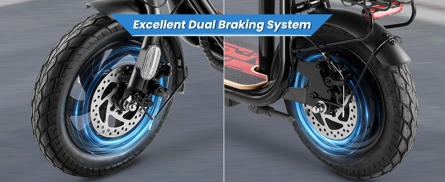 • 【12" Shock-Absorbing Pneumatic Tires】The 12-inch rubber pneumatic tires on this electric scooter with a seat offer excellent grip, high elasticity, and durability, significantly reducing impact from the ground. Whether on sand, mountain trails, snow, or various terrains, they ensure a more comfortable and stable ride.